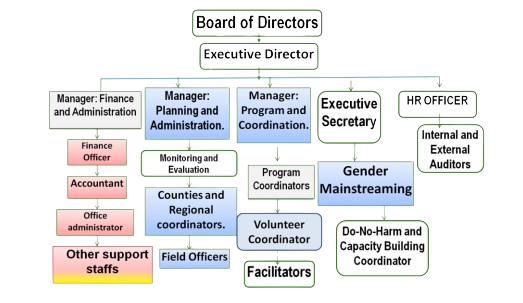 The Executive Director is answerable to the Board of Directors and is responsible for the day-to day execution of the activities of the organization. Her/his responsibilities and duties include, hiring and firing as well as promotion and transfer of necessary employees at head quarters and project levels (with the assistance of the employment and promotion committee and the approval of the Board), reporting the activities and achievements of the different projects to the Board and to Donor agencies on quarterly basis (unless the agreement with specific donors requires otherwise), presenting internal audit reports annually and external audit reports at the termination of specific projects.